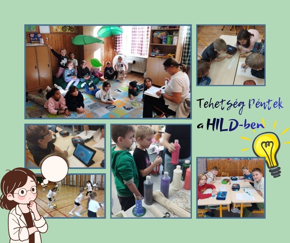 A Hild József Általános Iskolában kéthetente, péntek délutánonként különleges hangulat tölti meg az iskola termeit: ilyenkor zajlanak a Tehetség Péntek csoportközi foglalkozások. Az alsó tagozatos tanulók - az 1-2. és a 3-4. évfolyam diákjai - négy-négy különböző tevékenységtípus közül próbálhatják ki magukat. A csoportok forgó rendszerben vesznek részt a foglalkozásokon, így mindenki megismerhet többféle területet: a rajz, a sport, a mese-dráma, a környezetismeret, a matematikai, logikai és anyanyelvi játékok vagy éppen a digitális kultúra világát. A program célja, hogy a gyerekek minél több mindenben kipróbálhassák magukat, és felfedezzék, miben ügyesek, miben lelik örömüket. A pedagógusok szeretettel és odafigyeléssel segítik őket abban, hogy kibontakoztathassák tehetségüket - akár a művészetek, akár a természettudományok, a nyelv vagy a sport területén. A Tehetség Péntek nemcsak fejleszt, hanem örömteli közösségi élményt is nyújt: a tanulók új élményekkel, sikerélménnyel és önbizalommal gazdagodva vághatnak neki a következő hétnek."A tehetség ott kezdődik, ahol az elhatározás megszületik, hogy megmutatjuk, mire vagyunk képesek." Márai Sándor